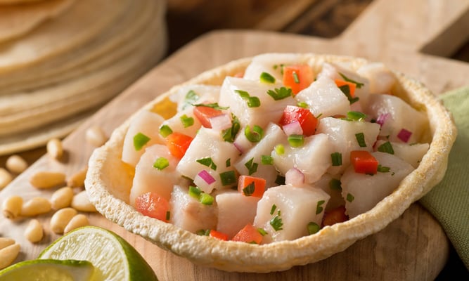 If you’ve never tried the citrusy seafood known as ceviche, now’s the time! Just the freshest raw fish, some citrus, and a garnish of cilantro.